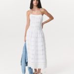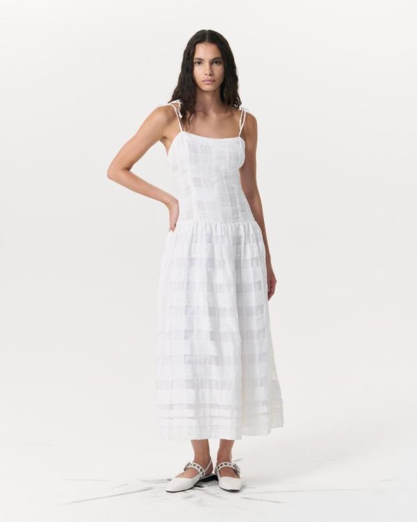 Looking for the perfect spring dress? Your search ends here. Crafted from a lightweight cotton blend woven with an oversized, semi-sheer tonal gingham pattern, this airy, ultra-feminine style will be your ideal companion for any of the season’s occasions (and those throughout the summer). It’s fully lined to ensure coverage and features slender straps you can re-tie to adjust the neckline.