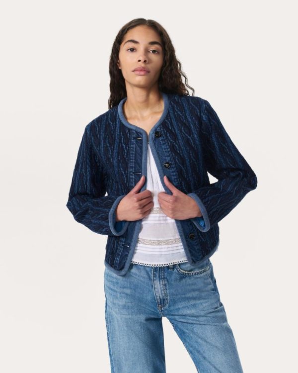 Heritage outerwear, done the rag & bone way. This lightweight layer fuses the profile of a classic lady jacket with medium-dark indigo denim featuring custom cable-embroidered quilting. It’s crafted from Lightweight Rigid non-stretch denim and is fully lined and filled for a touch of warmth.