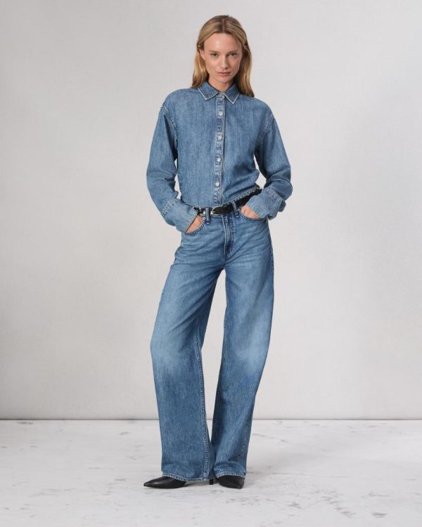 The Logan. Our laid-back, mid-rise jean with a roomy cut through the hip and thigh. Pro tip: take your natural size and wear low on your waist for a relaxed look or size down for a high-rise look. Crafted in Featherweight denim with a relaxed fit. In River, a medium indigo wash with a clean hem.