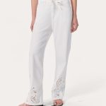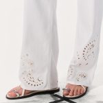 The Phoebe Beach Pant. Mid-rise jeans made for warmer days with a relaxed, laid-back fit and a drawstring waistband. Crafted from Ultra Featherweight, the lightest version of our supremely soft and airy denim with an effortless drape. In White Eyelet, a clean white wash featuring cutout paisley patterns embroidered at the hem.