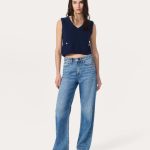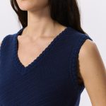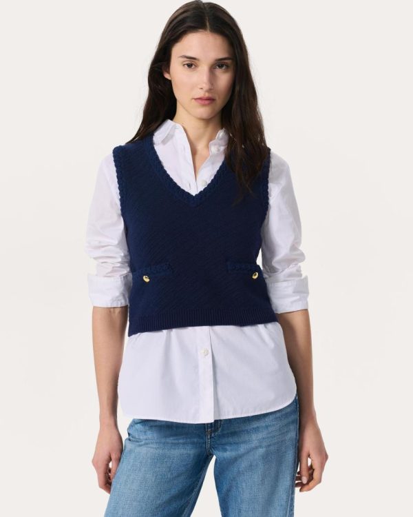 A V-neck vest for warmer days. Knit with a dimensional stitch from lightweight cotton-blend yarn, this relaxed, slightly cropped top doubles down on texture with tonal braiding along the edges and polished metal dome buttons at the pockets.