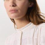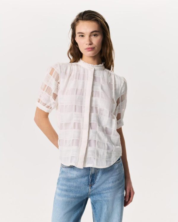 Reinventing the classics the rag & bone way. This fresh take on the plaid shirt reimagines the classic button-up for warmer weather in a lightweight cotton blend woven with an oversized, semi-sheer tonal gingham pattern. Cuffed short sleeves, hidden buttons, and a ruffled band collar further elevate the chic, feminine style.