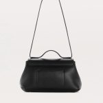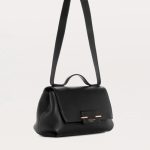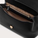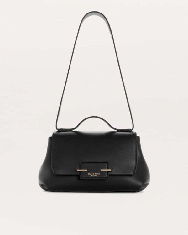 A sophisticated new flap bag designed for versatility. This structured style is crafted from smooth leather and punctuated by sleek metal bars. Top handles allow you to carry it by hand or over your shoulder, while the back patch pocket offers quick access to cards.